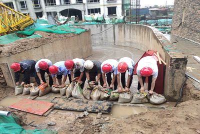 防汛演練緊貼實際。首先項目部按照預(yù)定方案和針對現(xiàn)場地形,最容易產(chǎn)生積水的車庫成為了此次防汛的重點搶險位置。在演練過程中于立功以身作則,沖在防汛最前面,帶領(lǐng)工人扛沙袋,設(shè)置警戒線,在車庫入口做好擋水墻;現(xiàn)場臨電電工接通電線,啟動移動水泵等搶險設(shè)備抽排積水;清淤小組打開雨水篦進(jìn)行人工助排,快速清理路面淤泥垃圾等,搶險現(xiàn)場各項工作井然有序進(jìn)行。演練過程中全體人員士氣高昂、配合默契、銜接流暢,圓滿地完成了防汛應(yīng)急演練。