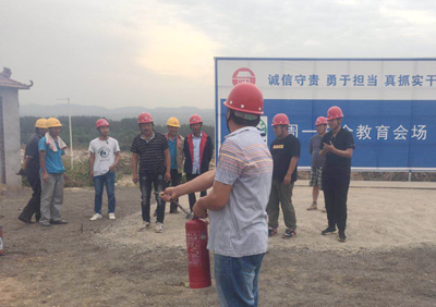 項目部即將進(jìn)行墊層混凝土澆筑施工,現(xiàn)場有大量的木模板、油漆等易燃品,正值高溫季節(jié),火災(zāi)隱患較大。項目部結(jié)合現(xiàn)場實際組織了本次消防演練,演練分為消防知識培訓(xùn)和火災(zāi)事故演練兩部分。演練前項目經(jīng)理李宏偉通報了溫嶺槽罐車爆炸事故造成的嚴(yán)重后果,闡明本次演練的目的和意義。隨后項目部安全員王東春對滅火常識、火災(zāi)逃生方法、滅火器如何使用等進(jìn)行了講解,并演示了手提式干粉滅火器的具體使用方法,參與演練的人員親自體驗了滅火器的使用。