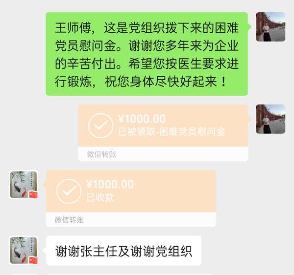 “現(xiàn)在身體怎么樣?生活可有什么困難?”因受疫情影響,不能對所有困難黨員和困難職工實(shí)現(xiàn)入戶走訪,公司黨委和工會就通過電話一一聯(lián)系,仔細(xì)詢問他們疫情防控期間生活情況、身體健康狀況,根據(jù)他們的實(shí)際情況,將慰問金通過微信轉(zhuǎn)賬發(fā)給個人,米面油等慰問品能送到小區(qū)門口的送到小區(qū)門口,能送到工地的送到工地。