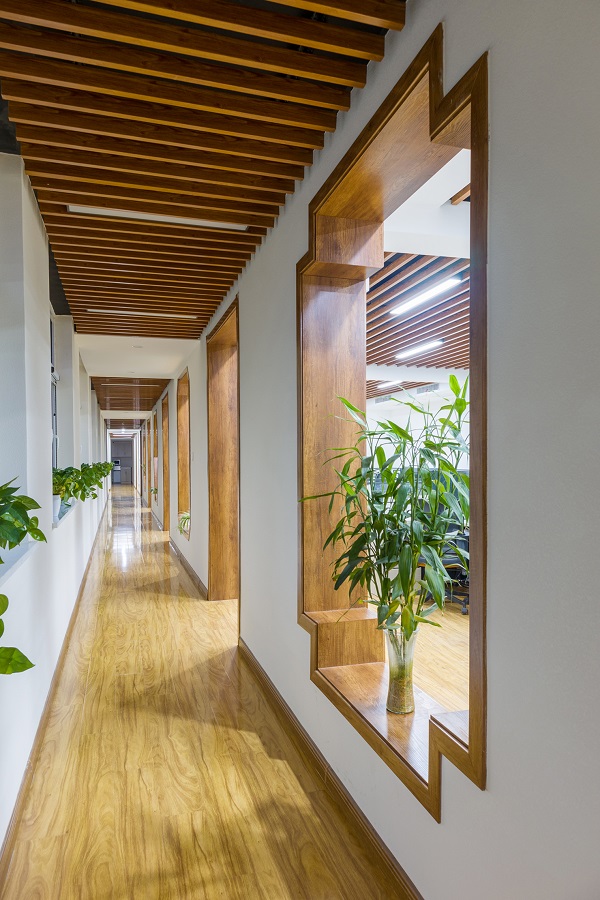 由于辦公區(qū)裸露門洞窗洞較多,極具藝術(shù)感,于是在設計風格方面設計師借鑒了中式古典花窗元素,將四個窗洞設計為不同造型,曲直轉(zhuǎn)折均一絲不茍,淋漓盡致地展現(xiàn)出中式古典花窗的特點,使得簡潔的空間多了一絲東方韻味。這樣舒適雅致的辦公環(huán)境更能激發(fā)設計師的創(chuàng)作靈感,讓設計師創(chuàng)作出更好的設計作品。