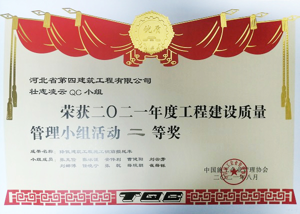10月中旬,公司收到中國施工企業(yè)管理協(xié)會《關(guān)于公布2021年工程建設(shè)優(yōu)秀質(zhì)量管理小組的通知》,在中國施工企業(yè)管理協(xié)會工程建設(shè)質(zhì)量管理競賽中,七分公司壯志凌云QC小組經(jīng)過初賽、復(fù)賽、決賽三個階段比拼,最終榮獲二等獎。