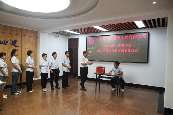 洪水無情,四建有愛。公司發(fā)揚“一方有難,八方支援”的中華民族優(yōu)良傳統(tǒng),9月7日—14日,僅一周時間,全體職工匯聚愛心捐助款項共計111723元,通過集團公司賬戶捐獻給易縣人民,用于易縣抗洪救災(zāi)和災(zāi)區(qū)人民重建家園。