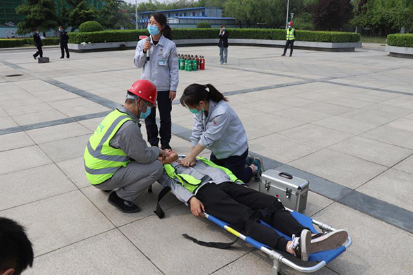 上午10點,消防救援支隊講解員對全體人員進行消防安全知識培訓(xùn),詳細(xì)講解了防煙面罩正確佩戴方法、疏散逃生要領(lǐng),以及滅火器的使用方法和注意事項。10點半左右,演練正式開始,施工現(xiàn)場三區(qū)二層濃煙滾滾,“著火了,著火了¨¨¨”項目安全員在現(xiàn)場巡查時發(fā)現(xiàn)火情高聲呼喊,周圍施工人員迅速拿滅火器進行滅火,項目經(jīng)理張玉賓接到險情后馬上通知義務(wù)消防隊員滅火并組織緊急疏散。大家用濕毛巾捂住口鼻,俯身低頭按照演練逃生路線快速從現(xiàn)場撤離到演練集合區(qū)。在大家撤離火災(zāi)現(xiàn)場的同時,救援組孫杰、楊克、董擁軍等人把傷員抬到通風(fēng)處,他們在醫(yī)療救護組的指導(dǎo)下,用雙手拍打傷者雙肩并呼叫他的名字、用觸摸頸動脈等方法斷傷者是否喪失意識,并進行心肺復(fù)蘇。心肺復(fù)蘇演練時,按壓胸部是最有效也是最常用的辦法,施救人員首先在傷者兩乳頭連線中間,胸骨中下三分之一處找準(zhǔn)按壓點,然后用手掌根部緊貼傷者胸部,兩手重疊,五指相扣,手指翹起,肘關(guān)節(jié)伸直,用上身重量垂直下壓30次,經(jīng)過救治傷者最終蘇醒,整個搶救過程有條不紊,最后藁城區(qū)消防救援大隊長張海寧對應(yīng)急預(yù)案演練進行了點評,此次火災(zāi)應(yīng)急預(yù)案演練圓滿結(jié)束。
