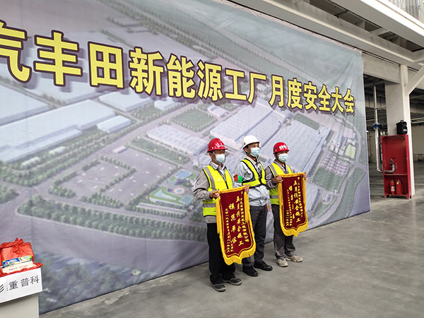 會(huì)上,業(yè)主對所有參建單位自開工以來的安全管理情況進(jìn)行了總結(jié),對兩家先進(jìn)集體和兩名先進(jìn)個(gè)人進(jìn)行了表彰。天津一汽樹脂車間項(xiàng)目部由于規(guī)范嚴(yán)謹(jǐn)?shù)墓芾?,在眾多施工單位中脫穎而出,榮獲“五月份安全施工模范單位”錦旗;項(xiàng)目安全員王喜峰榮獲“優(yōu)秀安全員”榮譽(yù)稱號。日方課長督查佐藤和一汽豐田汽車總部副總經(jīng)理相馬清親對天津一汽新能源工廠項(xiàng)目部安全工作給予了表彰,項(xiàng)目經(jīng)理苗建偉在會(huì)上做交流發(fā)言,介紹了項(xiàng)目施工安全管理經(jīng)驗(yàn)。