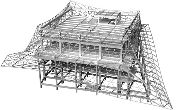 該工程表皮結(jié)構(gòu)采用圓鋼管相貫焊接的單層鋼網(wǎng)格結(jié)構(gòu),局部采用平面鋼桁架,表皮鋁板采用白色穿孔鋁板,雙曲穿孔鋁板外圈穿孔位置距邊線20mm,其余穿孔位置為不規(guī)則孔。面對(duì)外裝飾層鋼結(jié)構(gòu)造型復(fù)雜、精度要求高等挑戰(zhàn),項(xiàng)目部依托BIM技術(shù)構(gòu)建數(shù)字化解決方案,通過Tekla軟件精確計(jì)算桿件內(nèi)力和優(yōu)化拼裝單元,將傳統(tǒng)的二維圖紙轉(zhuǎn)化為三維可視化模型,便于更直觀地理解復(fù)雜節(jié)點(diǎn)和施工流程。利用Navisworks和BIMFILM軟件進(jìn)行施工動(dòng)畫模擬,通過三維可視化模型編排制作吊裝順序,形成吊裝三維演示動(dòng)畫,優(yōu)化施工順序和工序銜接,確保施工安全、質(zhì)量,有效提高施工效率。引入智能測(cè)量技術(shù),以全站儀、電子水準(zhǔn)儀等設(shè)備實(shí)時(shí)監(jiān)控安裝精度,形成“模擬預(yù)判+動(dòng)態(tài)糾偏”的質(zhì)量保障體系。在鋼網(wǎng)架安裝前,將全站儀、電子水準(zhǔn)儀、GPS定位系統(tǒng)采集的數(shù)據(jù)進(jìn)行綜合對(duì)比分析,提高測(cè)量放線精度,通過實(shí)時(shí)數(shù)據(jù)監(jiān)控及時(shí)調(diào)整施工過程中的誤差,實(shí)現(xiàn)動(dòng)態(tài)糾偏。鋼網(wǎng)架拼裝單元安裝完成后,通過實(shí)際測(cè)量采集數(shù)據(jù)與模型進(jìn)行對(duì)比,修正調(diào)整施工誤差。此外,項(xiàng)目部通過無(wú)人機(jī)掃描技術(shù)對(duì)安裝后的鋼結(jié)構(gòu)骨架成品空間坐標(biāo)進(jìn)行驗(yàn)收,為后續(xù)鋁板表皮安裝提供精準(zhǔn)數(shù)據(jù),確保建筑外觀效果與設(shè)計(jì)一致。